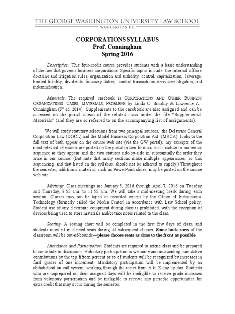 Corporations Cunningham Gw Law Spring 2016 Corporate Law Test